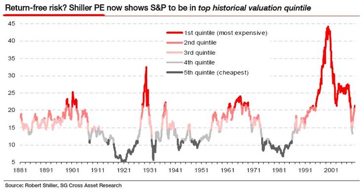 As Societe General's Dylan Grice points out: “According to Robert Shiller’s latest data, the S&P500 is back in its highest valuation quintile. The risk is there - as it always is - but the returns aren’t. So what do you do? Go take a holiday if you can.”