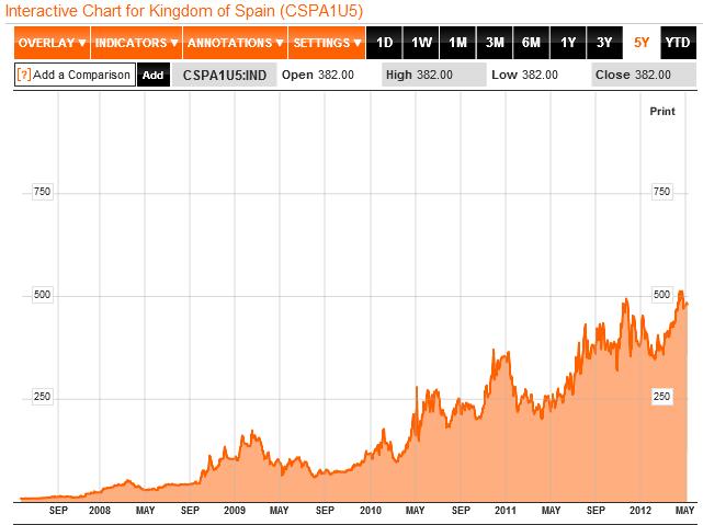 The following chart of Spain’s default risk (CDS) shows the persistent rise over the last few years.