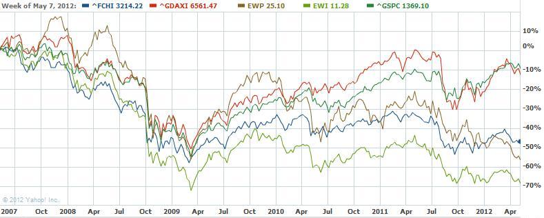 As you can see from the stock index chart below, Italy (EWI - spicy mustard) and Spain (EWP - brown) are sitting at their 2009 lows. France (^FCHI - blue) is not too far behind. Compare this to Germany (^GDAXI - red) and the U.S. (S&P500 - green) which have obviously held up better. All are trading in a similar fashion and will converge as we get closer to the bottom.
