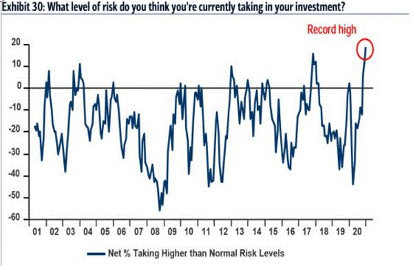 Wall Street is warning of "market excess" but is unable to provide useful advice. As Bloomberg reported; "BofA has also asked fund managers for the last 20 years whether they consider themselves to be taking a risk. This number has never been higher.”