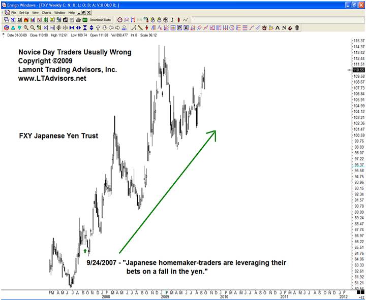 With that in mind, this week’s Wall Street Journal article: Small investors make big bets on currencies should be of interest. It reports that U.S. day traders are trading in foreign currency with leverage “as much as 500 to 1. That allows an investor to put up just a few hundred dollars of capital to make a bet of tens or hundreds of thousands of dollars.” How widespread is this kind of trading? It “now approaches $120 billion. That is up about 20% from a year ago and nearly double the level three years ago, according to Aite Group, a Boston-based financial-services industry research and advisory firm.” And why are these neophytes drawn to trading foreign currency? “The heightened interest in currency trading comes as the dollar is sagging.” Just as in 2007, we have novice day traders betting with large leverage on a falling currency. Expect a similar uptrend in the depressed currency, this time the U.S. dollar, as leveraged day traders meet a fate similar to the Japanese homemaker-traders of two years ago.