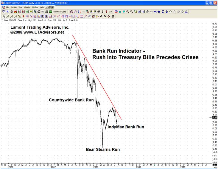 As we pointed out last August, the fall in the Treasury Bill Yield shows investors rushing into cash. Depositors running to the bank want the same thing: cash. Same action, different venue.