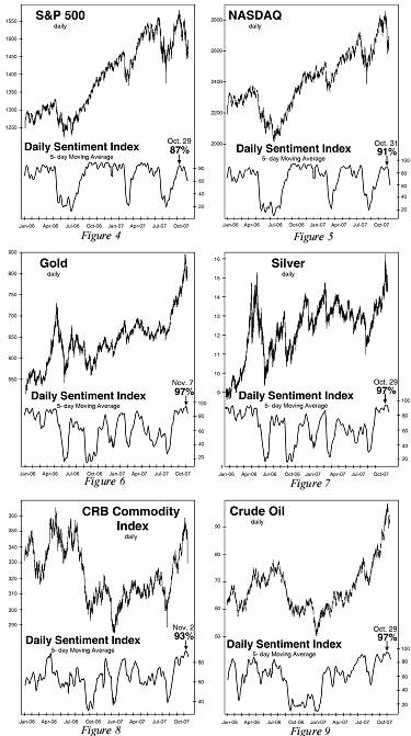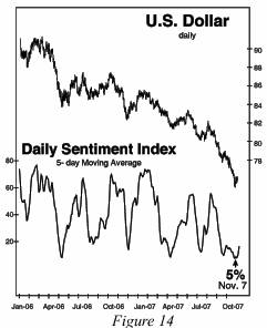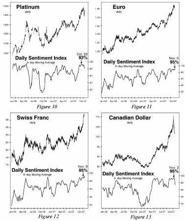 Despite the widening of the credit crunch, home prices "falling the sharpest on record," homeowners feeling the pinch and earnings coming in weaker-than-expected; Wall Street traders have maintained a bullish position towards almost every asset class. The charts below, compliments of The Elliot Wave Theorist (Elliotwave.com), show recent sentiment levels from MBH Commodities’ Daily Sentiment Index.