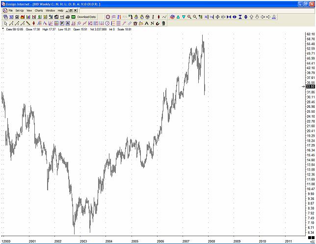 Art prices are also reacting to the credit bust. On November 9th, Sotheby’s had to pay out on price guarantees after they failed to sell Impressionist and Modern art. Its stock price is below.