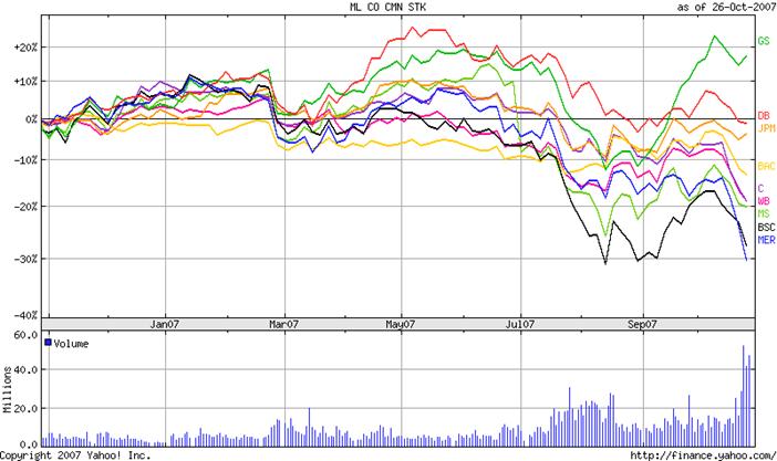 To see how the banks stand as of now, we have created a chart comparing stock price over the last year. Merrill Lynch has recently taken the lead from Bear Stearns with the ousting of its CEO.